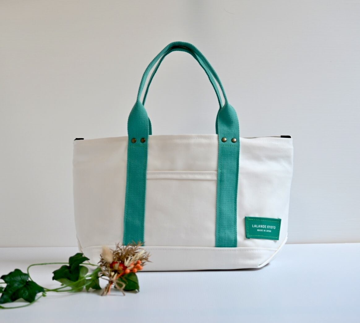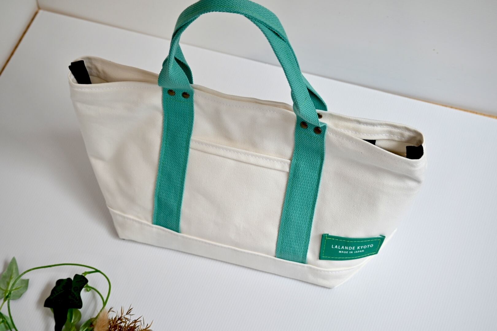 綺麗なオフホワイトのベース帆布に爽やかなミントグリーンのアクセントを入れて仕立てています。